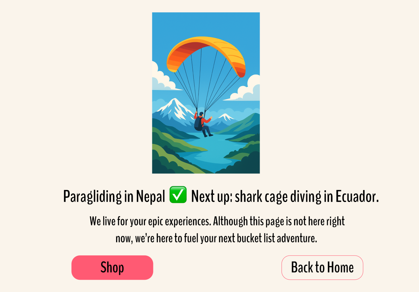 “Paragliding in Nepal ✅ Next up: shark cage diving in Ecuador.” We live for your epic experiences. Although this page is not here right now, we’re here to fuel your next bucket list adventure.